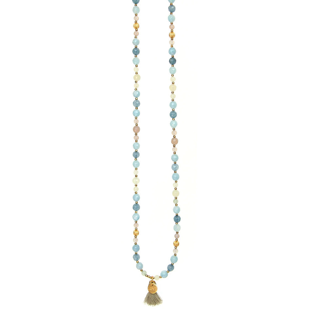 Der vergoldete „Love“-Anhänger setzt ein charmantes Statement, das durch die feine Quaste (ca. 1,5 cm) verspielt ergänzt wird. Jeder Stein trägt seine eigene Maserung und Farbnuance – so wird jede Kette zu einem Unikat.