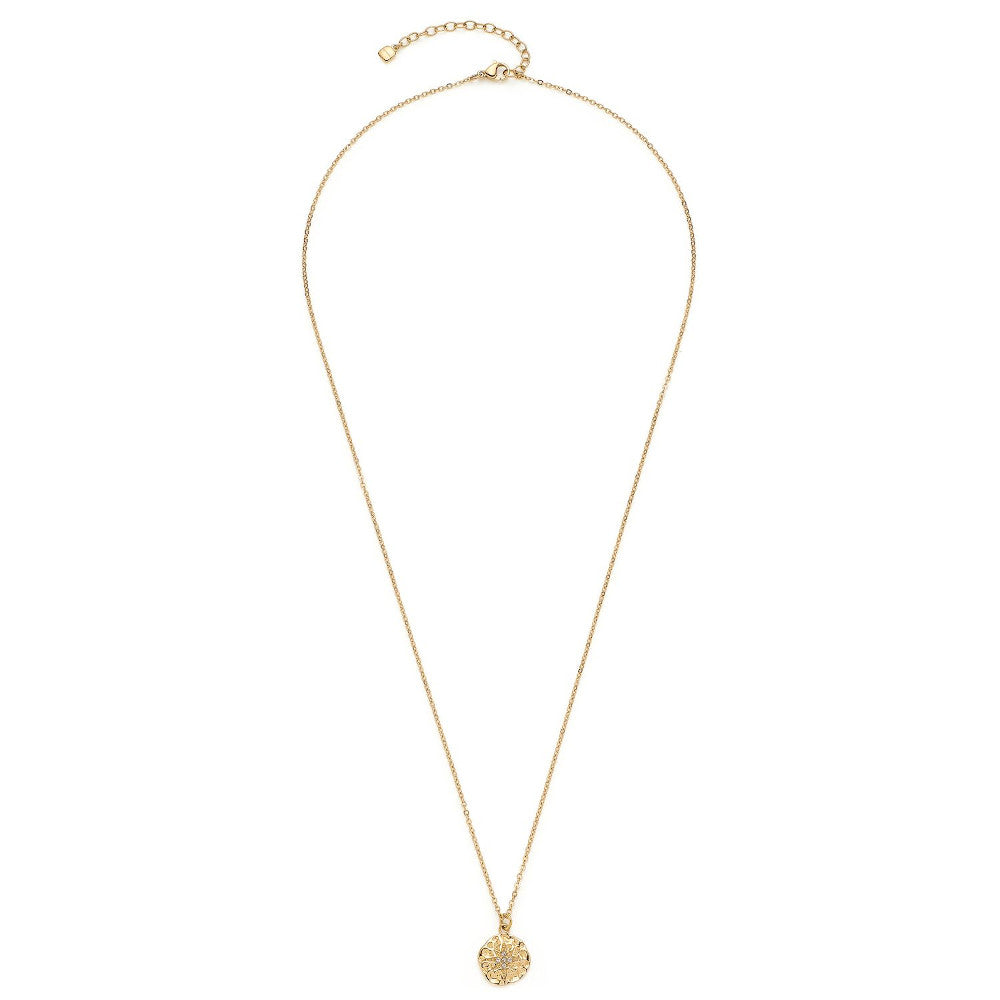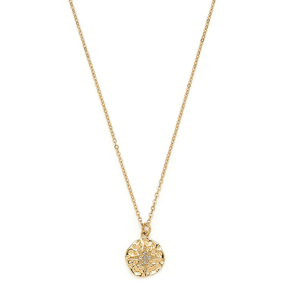Im Mittelpunkt steht der gehämmerte Münzanhänger, der an antike Schmuckkunst erinnert und damit ein besonderes Highlight darstellt. Das Sternmotiv aus funkelnden Schliffkristallen bringt zusätzlichen Glanz und macht die Kette zu einem Blickfang bei Tag und Nacht.