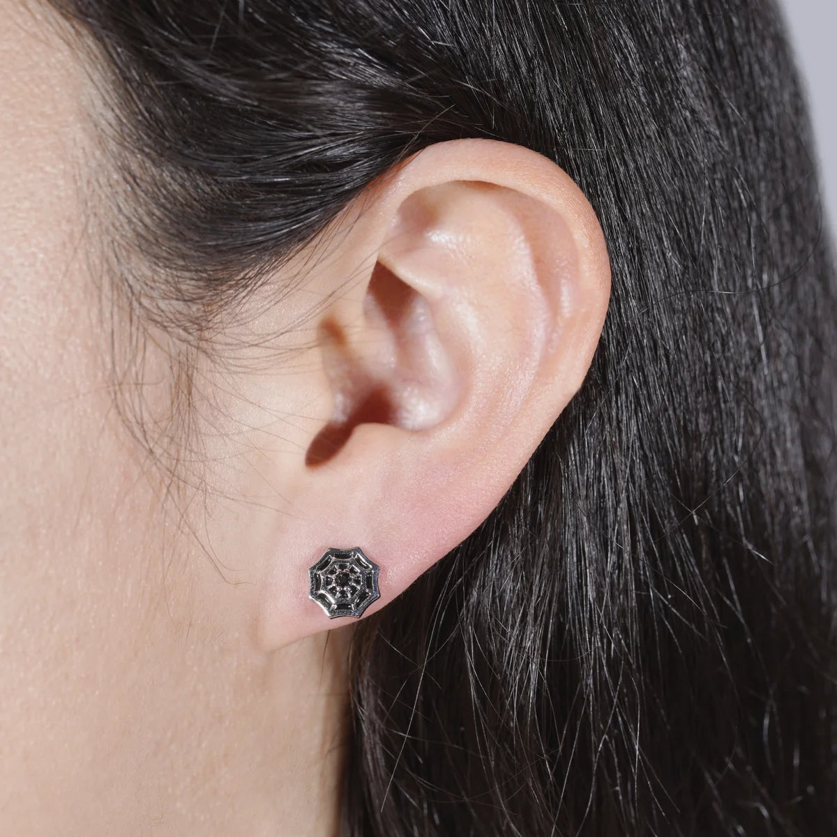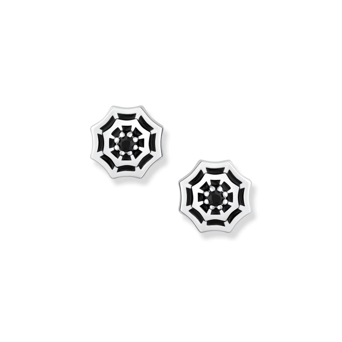 Feine Silberdetails und die abwechselnd gesetzte schwarze Emaille verleihen den Ohrringen ihre faszinierende Tiefe und unterstreichen die filigrane Gestaltung. Im Zentrum des Netzes funkelt ein schwarzer Zirkonia, der das Design edel abrundet und den Blick unmittelbar fesselt.