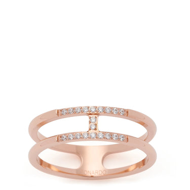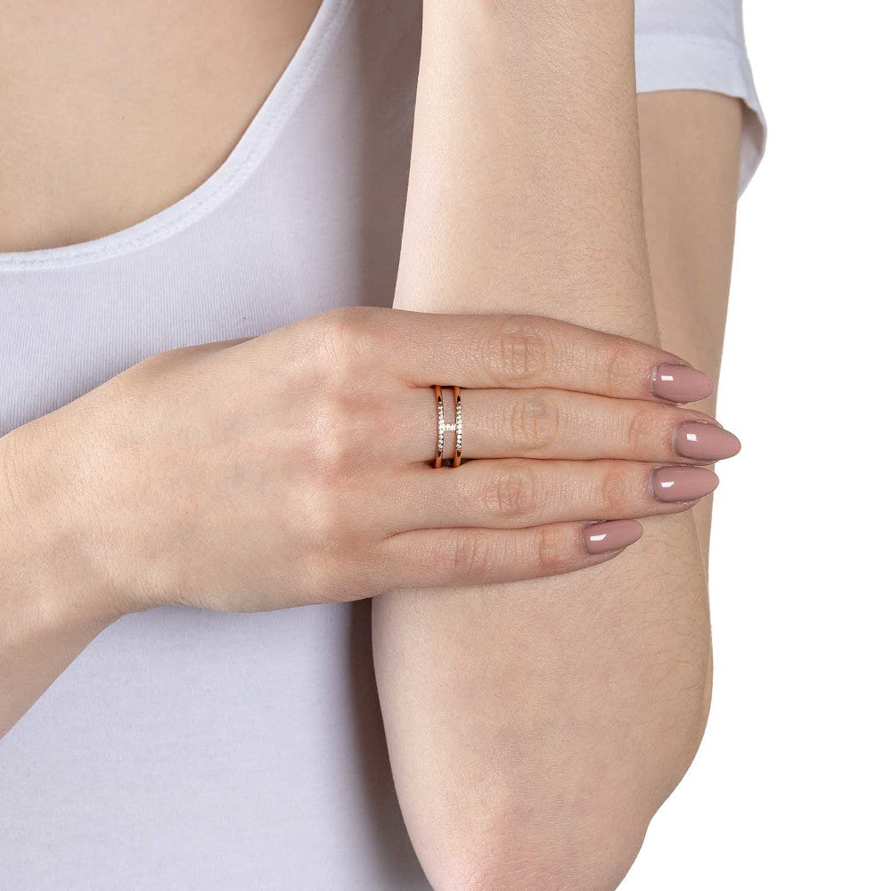 Besonderes Highlight sind die fein funkelnden Zirkoniasteinchen, die im vorderen Bereich für ein glanzvolles Funkeln sorgen und den Ring zu einem raffinierten Blickfang machen. Die Doppelschiene mit Steg verleiht dem Schmuckstück eine moderne, klare Form, die sich harmonisch an jede Hand anschmiegt.