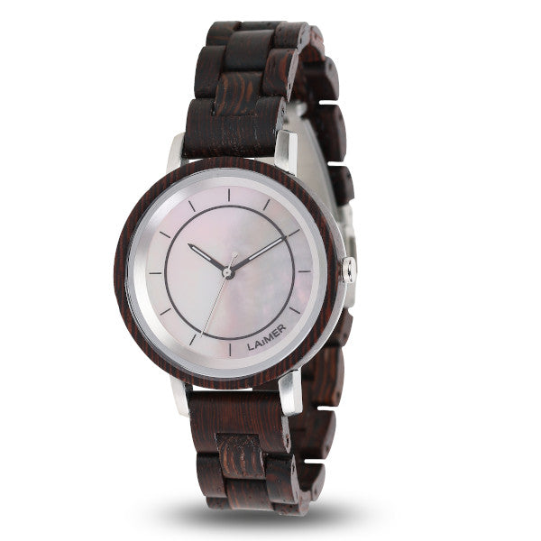 Karolin – die grazile Damenuhr aus Wengeholz mit Perlmutt-Zifferblatt. Ein Hauch Amalfiküste für Ihr Handgelenk.