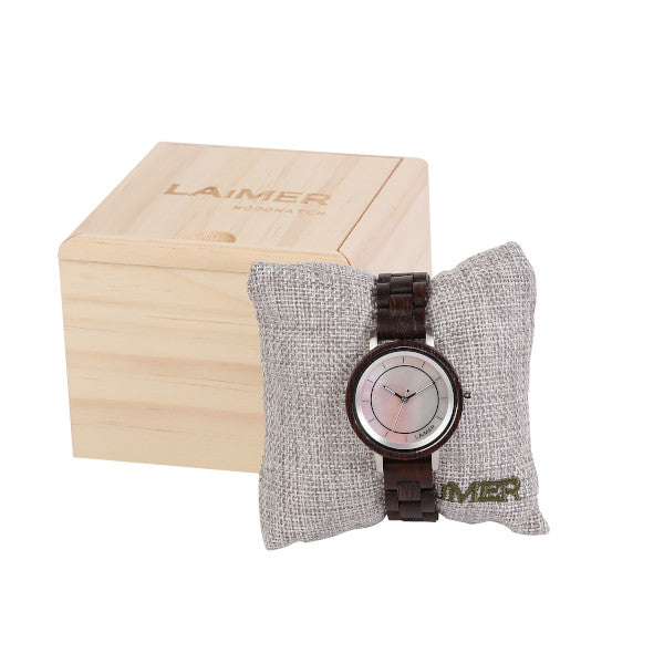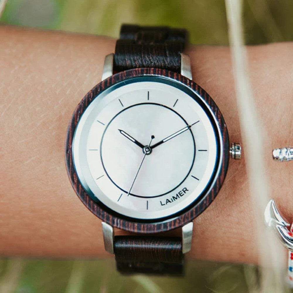 Die Damenuhr „Karolin“ von Laimer vereint natürliche Schönheit mit zarter Eleganz. Gefertigt aus edlem Wengeholz aus nachhaltiger Forstwirtschaft und einem rosa Perlmutt-Zifferblatt, ist sie ein stilvoller Hingucker, der an die Muscheln der Amalfiküste erinnert.