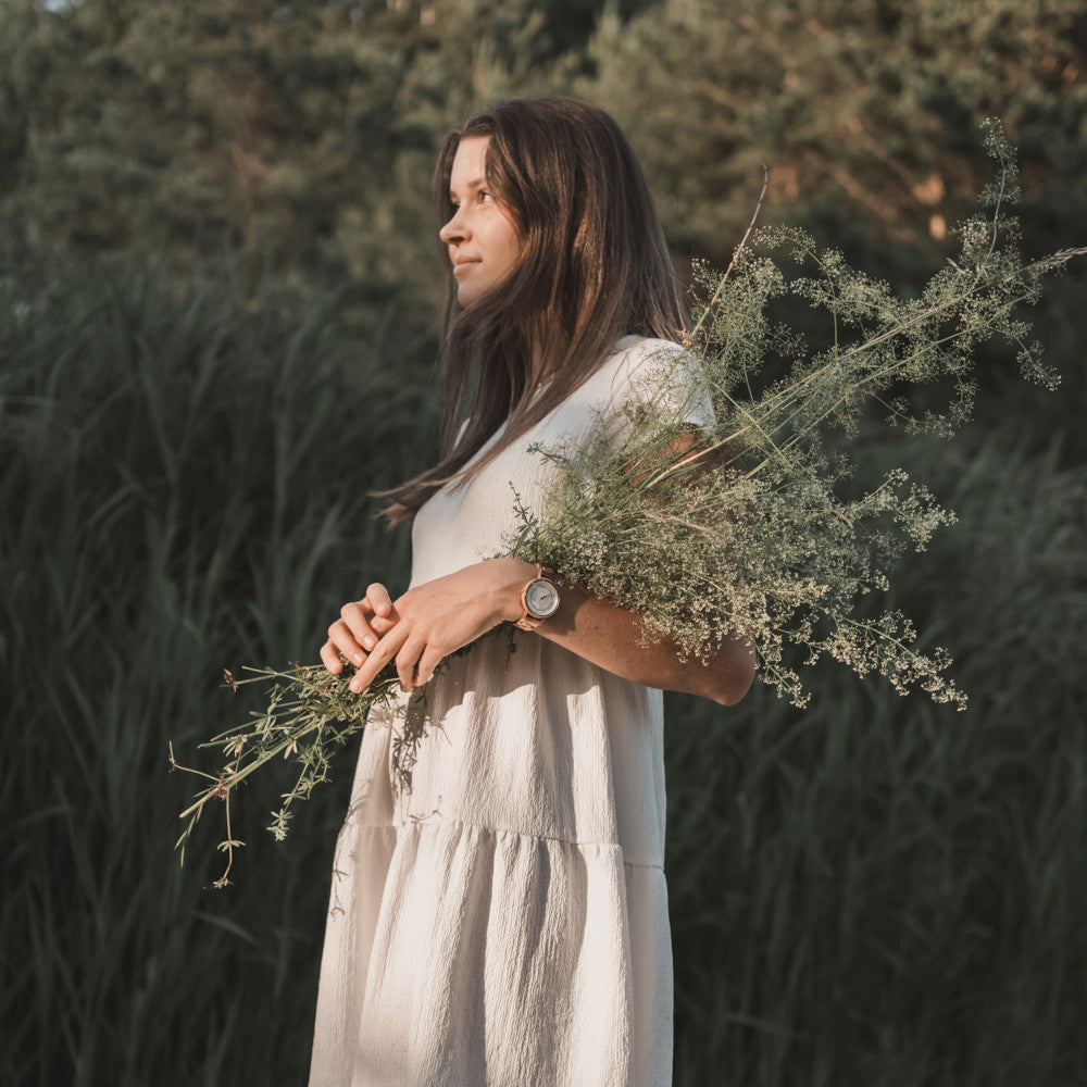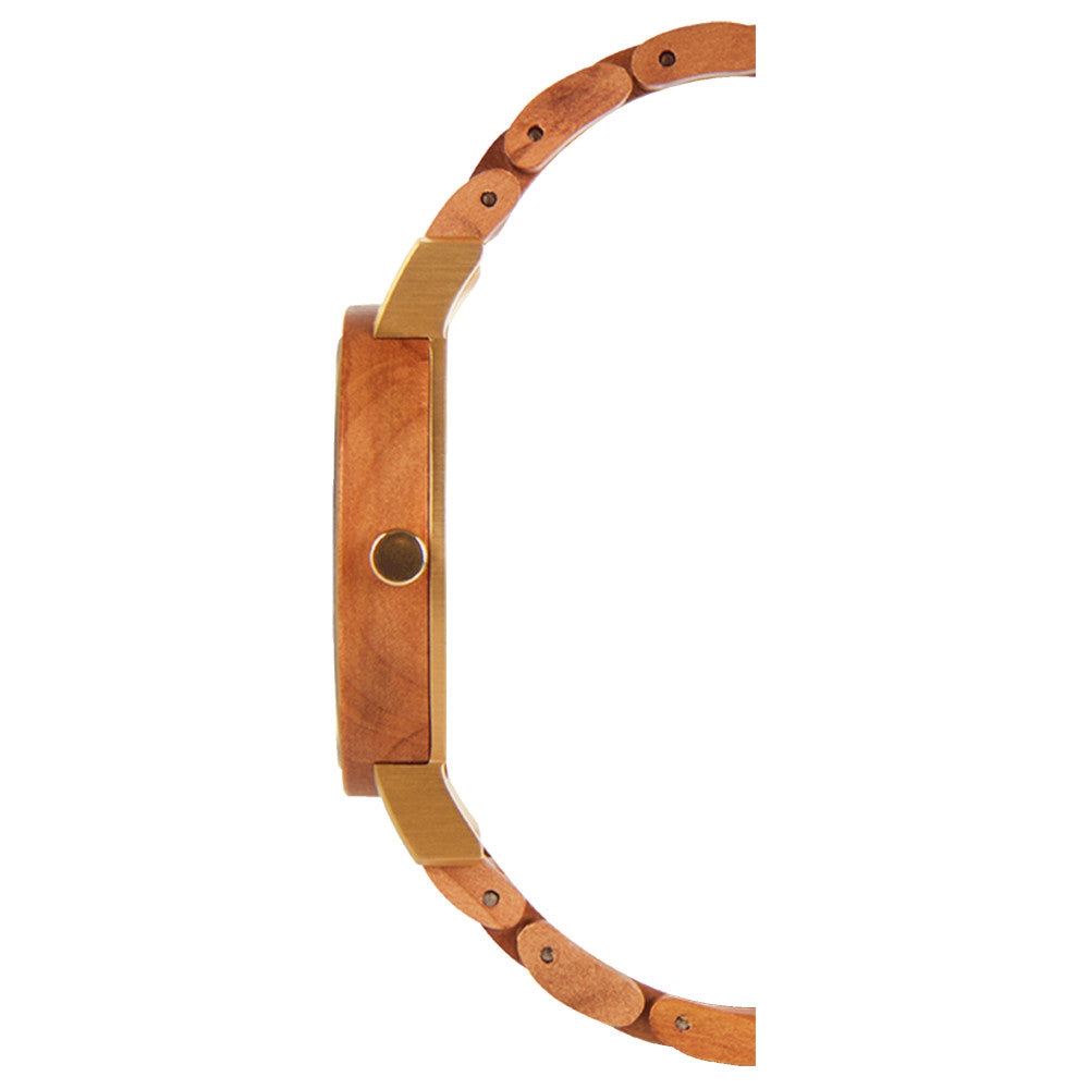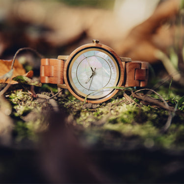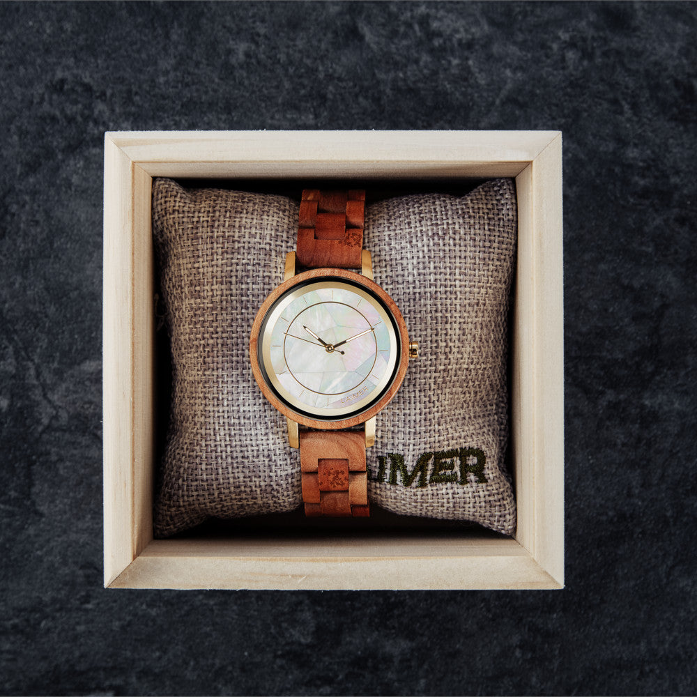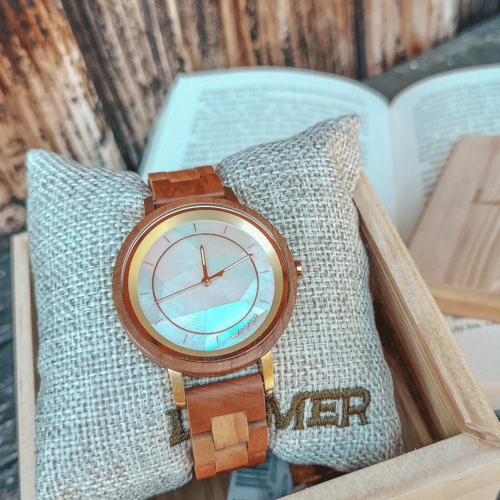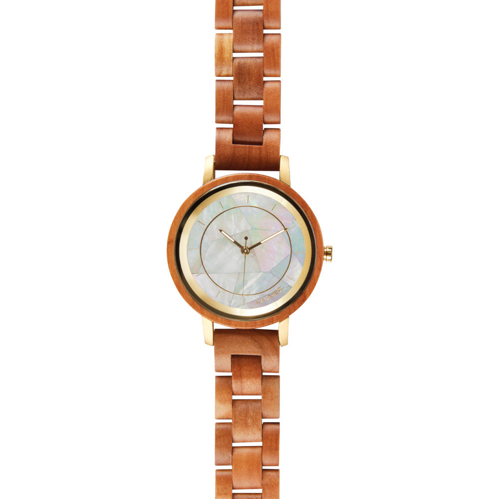 Kassandra – die elegante Damenuhr aus Apfelholz und Perlmutt. Ein filigranes Accessoire, das Natürlichkeit und Luxus vereint.