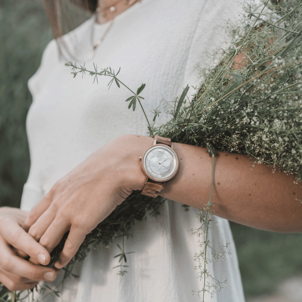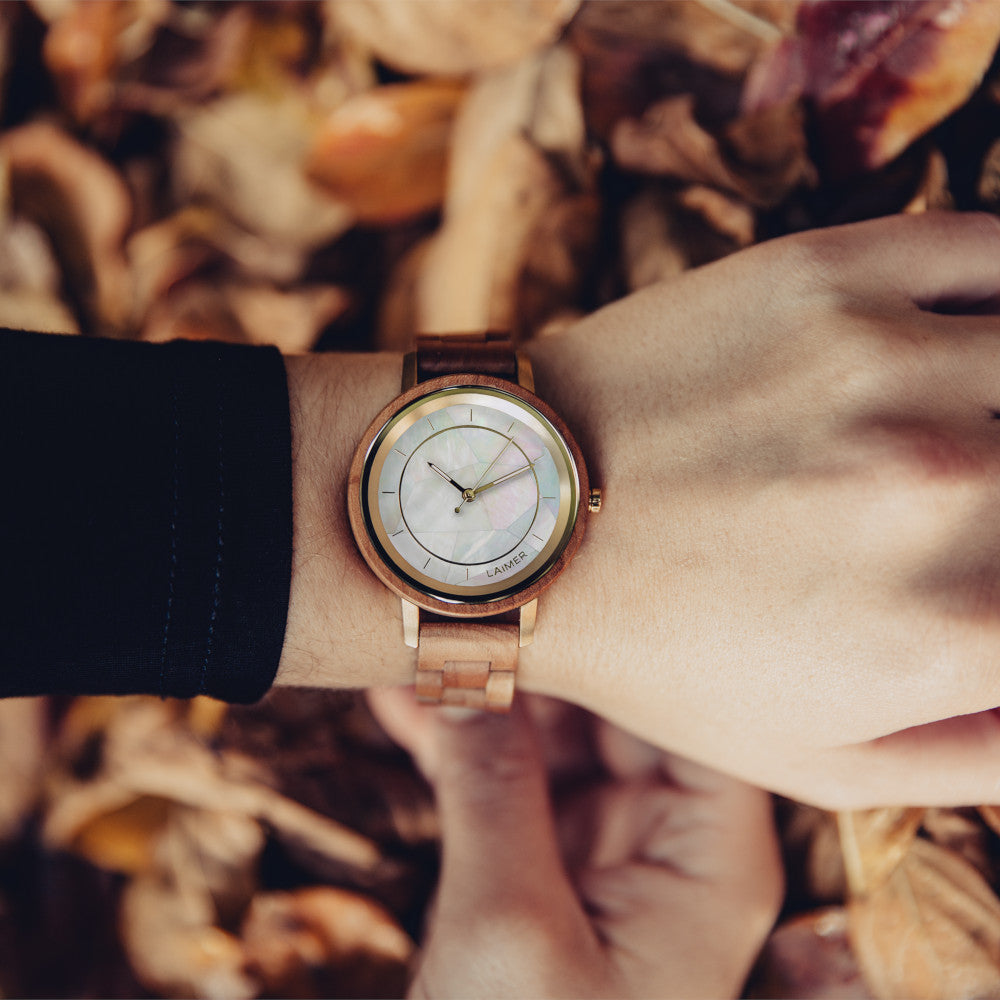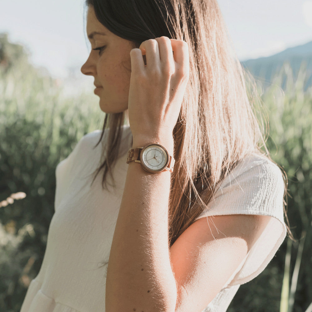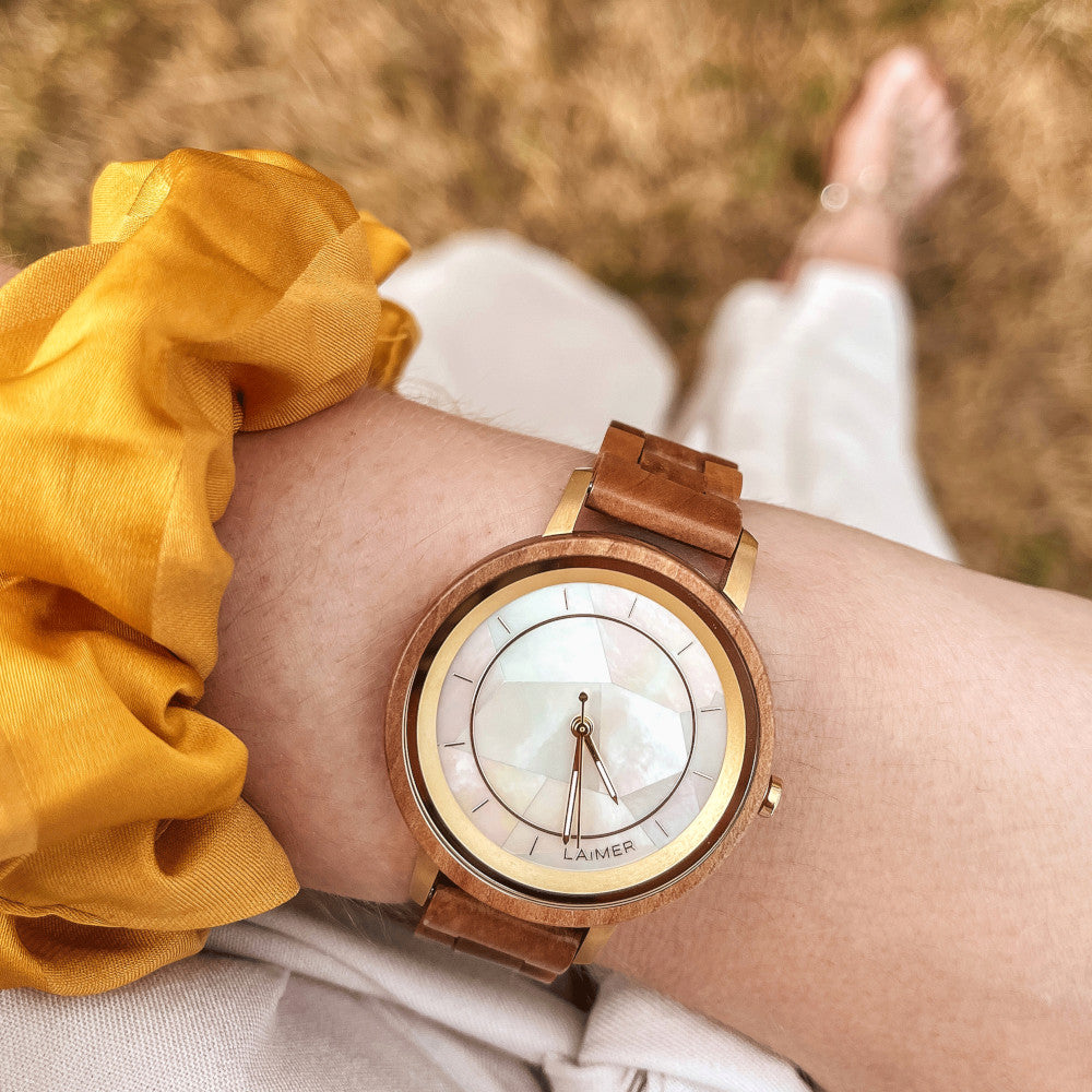 Die Damenuhr „Kassandra“ von Laimer ist eine Hommage an die Farben der Amalfiküste – elegant, natürlich und einzigartig. Gefertigt aus hellem Apfelholz und veredelt mit einem weißen Perlmutt-Zifferblatt, das durch recycelte Perlmutt-Splitter ein raffiniertes Muster erhält, bringt sie mediterranes Flair direkt an Ihr Handgelenk. Goldene Akzente unterstreichen die luxuriöse Wirkung, während das klare Design zeitlos bleibt.