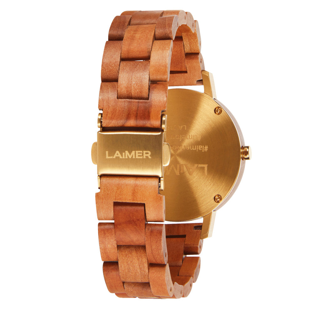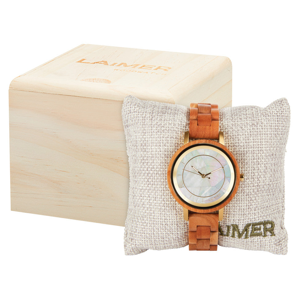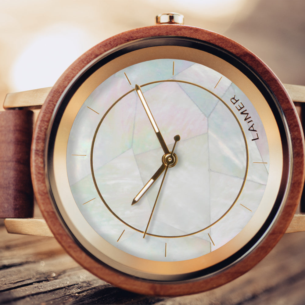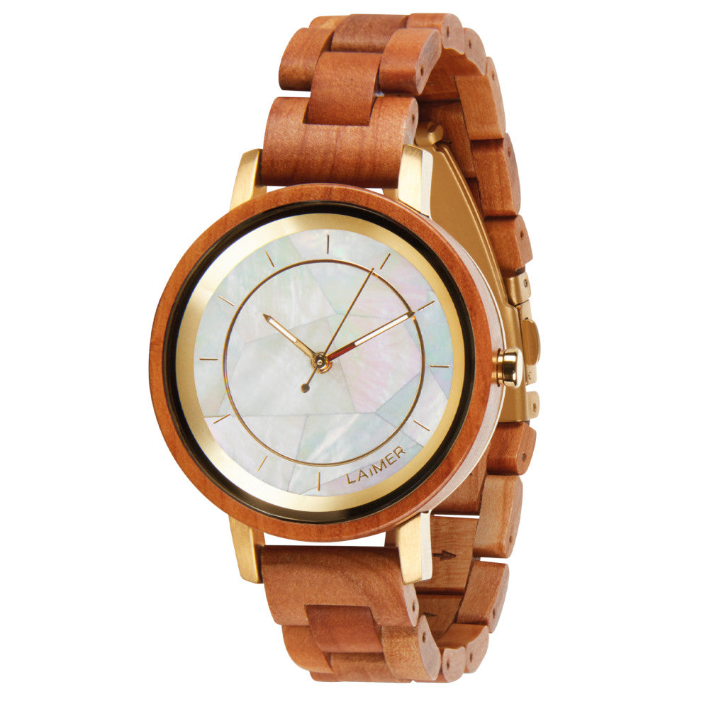 Die Damenuhr „Kassandra“ von Laimer ist eine Hommage an die Farben der Amalfiküste – elegant, natürlich und einzigartig. Gefertigt aus hellem Apfelholz und veredelt mit einem weißen Perlmutt-Zifferblatt, das durch recycelte Perlmutt-Splitter ein raffiniertes Muster erhält, bringt sie mediterranes Flair direkt an Ihr Handgelenk. Goldene Akzente unterstreichen die luxuriöse Wirkung, während das klare Design zeitlos bleibt.