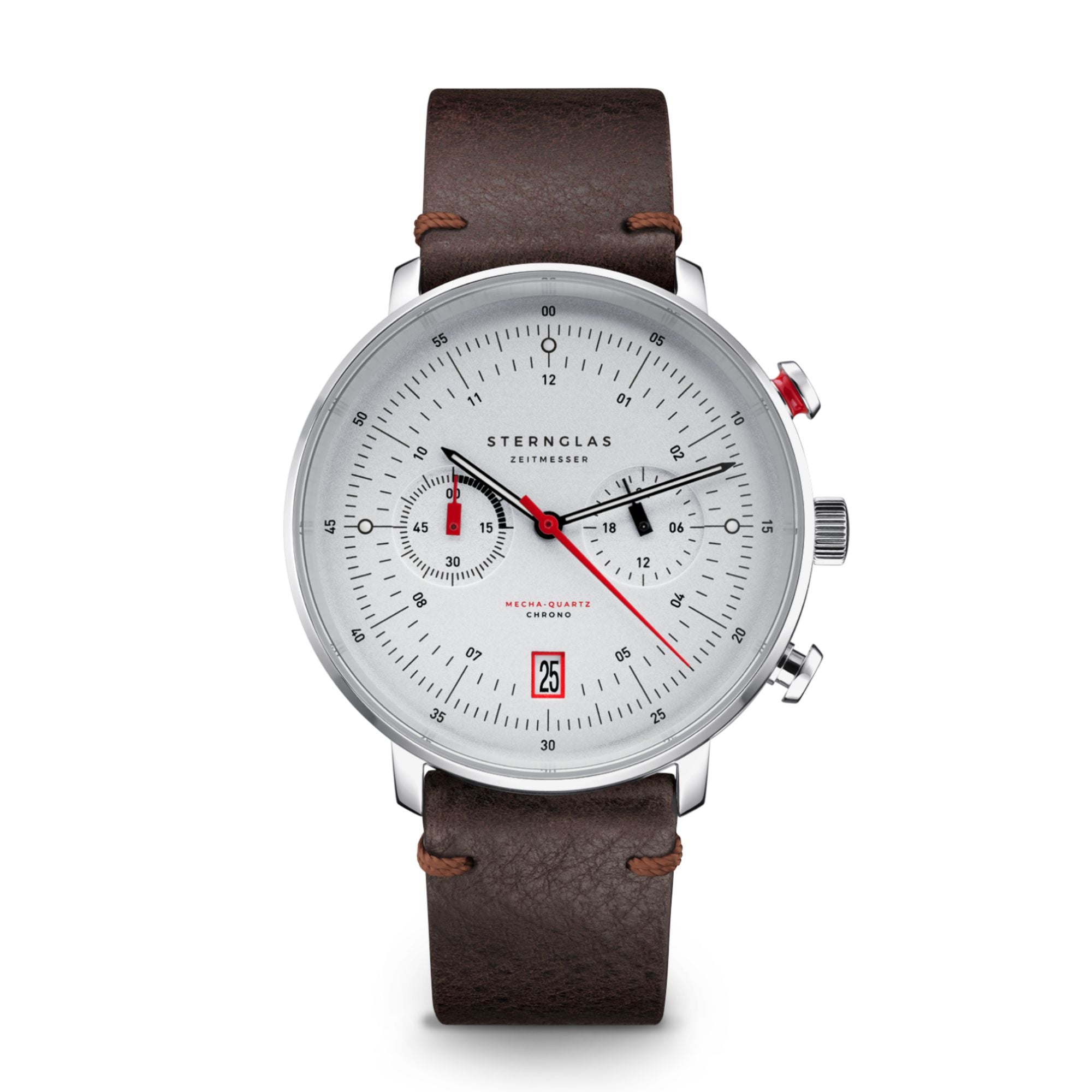 Die Herrenuhr Chrono Hamburg Silber-satiniert mit Armband in Vintage Mokka verbindet hanseatische Klarheit mit moderner Technik. Als Chronograph mit Mecha-Quarz-Uhrwerk bietet sie präzise Zeitmessung und einen fließenden Stoppuhrzeiger – perfekt für alle, die Funktionalität und Design gleichermaßen schätzen.
