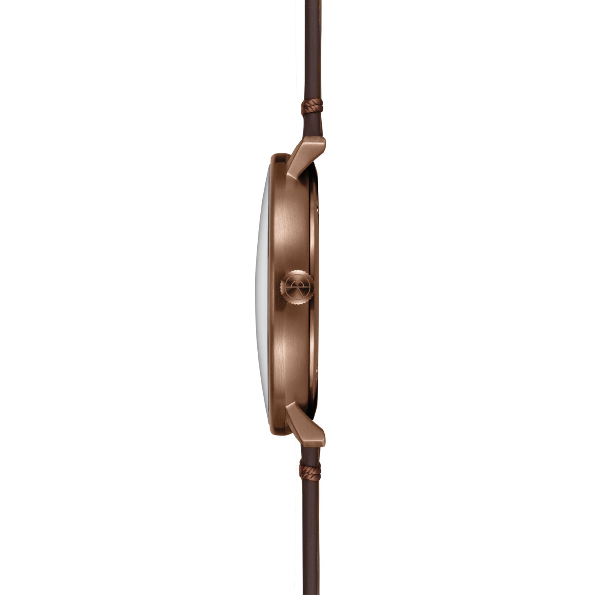 Mit einem Durchmesser von 42 mm und nur 6 mm Gehäusehöhe wirkt die Uhr markant und zugleich angenehm flach am Handgelenk. Das Vintage-Lederarmband in Mokka rundet den Look ab und verleiht ihr einen authentischen Charakter.