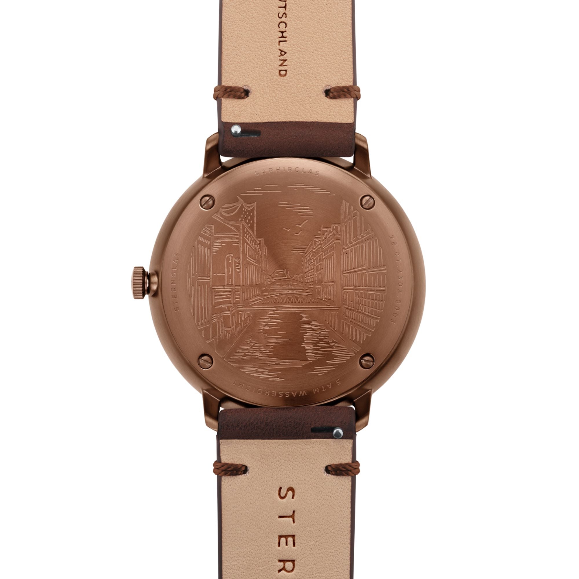 Technisch überzeugt die „Hamburg“ mit einem präzisen Ronda 715 Quarzwerk, geschützt durch ein gewölbtes, doppelt entspiegeltes Saphirglas. Die bronzefarbenen und orangefarbenen Zeiger mit Luminova-Leuchtmasse sorgen dafür, dass Sie die Zeit auch bei Dunkelheit zuverlässig ablesen können. Mit einer Wasserdichtigkeit bis zu 5 Bar ist die Uhr robust genug für den Alltag – und elegant genug für besondere Anlässe.