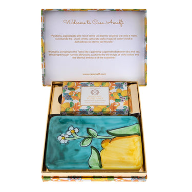 Das Geschenkset „Buongiorno Positano“ von CASA AMALFI ist ein Stück mediterraner Lebensfreude, das Schönheit, Handwerkskunst und luxuriöse Pflege vereint. In der liebevoll gestalteten Geschenkbox erwartet Sie eine handgefertigte Keramik-Seifenschale, inspiriert von der bunten Majolika-Tradition der Amalfiküste. Jedes Stück ist ein Unikat und bringt italienische Eleganz direkt in Ihr Zuhause.