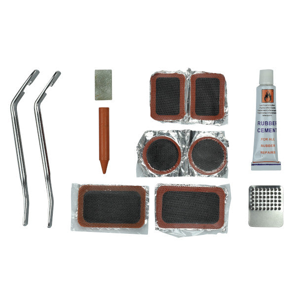 Das praktische Kit enthält alles, was Sie für eine unkomplizierte Reparatur benötigen: von stabilen Metallhebeln über Flicken in verschiedenen Größen bis hin zu Kitt, Schaber, Wachsstift und Kreide. Damit sind Sie für nahezu jede Reifenpanne gewappnet – egal ob auf dem Weg zur Arbeit, bei einer langen Tour oder beim Wochenendausflug.