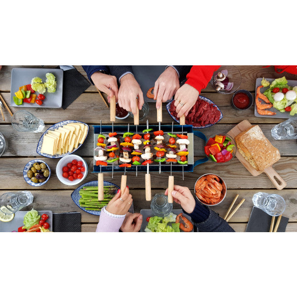 Das Set enthält ein Raclettepfännchen, sechs Spieße mit Holzgriffen, sechs praktische Holzzangen sowie eine Planche. Damit gelingen Ihnen nicht nur klassische Grillgerichte, sondern auch feine Raclette-Momente, köstliche Spieße und knackiges Gemüse vom Grill.