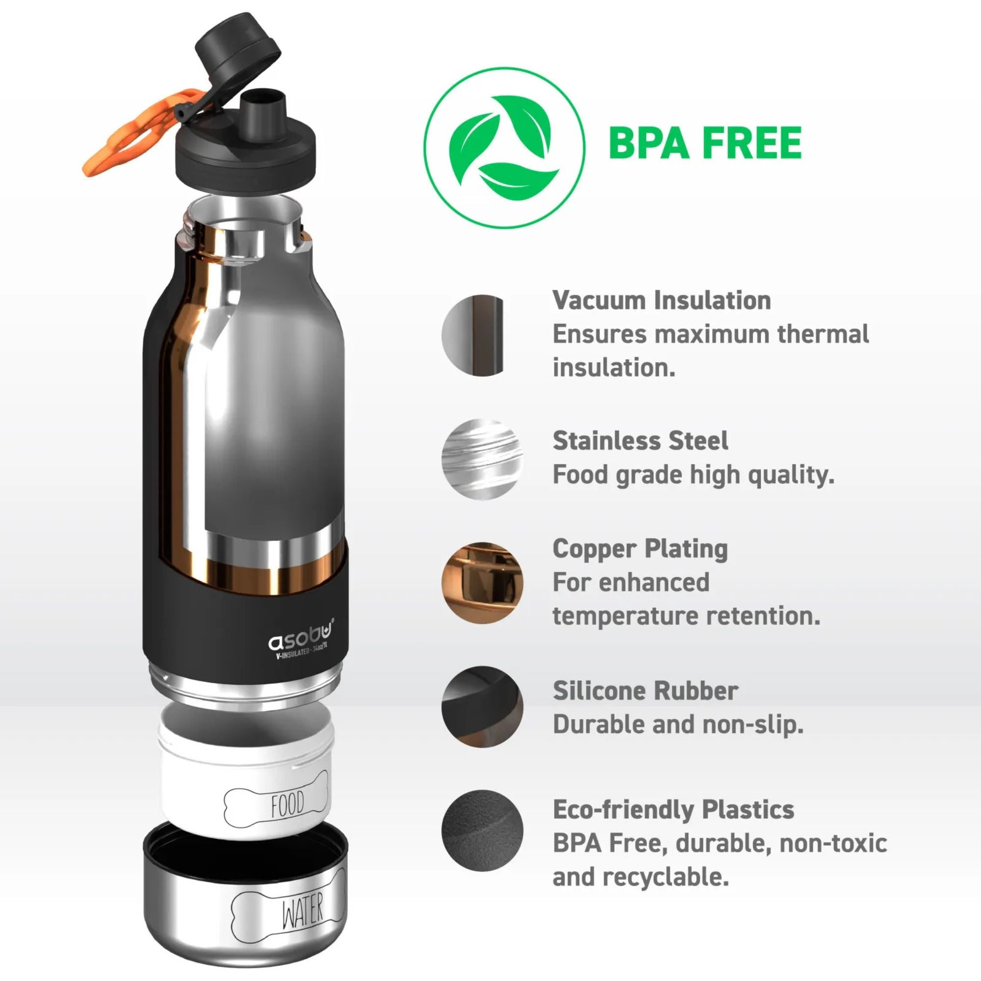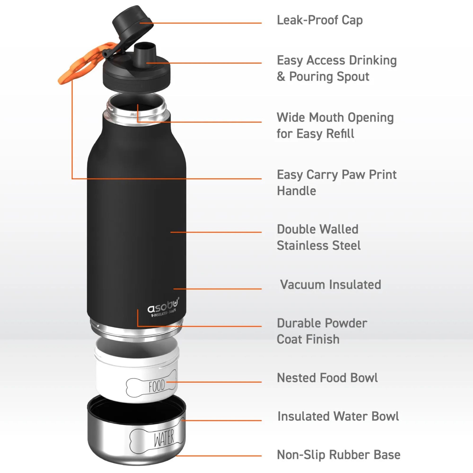 Die doppelwandige, vakuumisolierte Edelstahlflasche hält Getränke zuverlässig kühl. Durch das smarte Design können Sie direkt aus der Flasche trinken, während Ihr Hund seinen Durst aus dem abschraubbaren Napf am Boden stillt. Zusätzlich gibt es einen zweiten integrierten Napf, perfekt für Futter oder Leckerlis. Alles hygienisch getrennt, platzsparend und griffbereit.