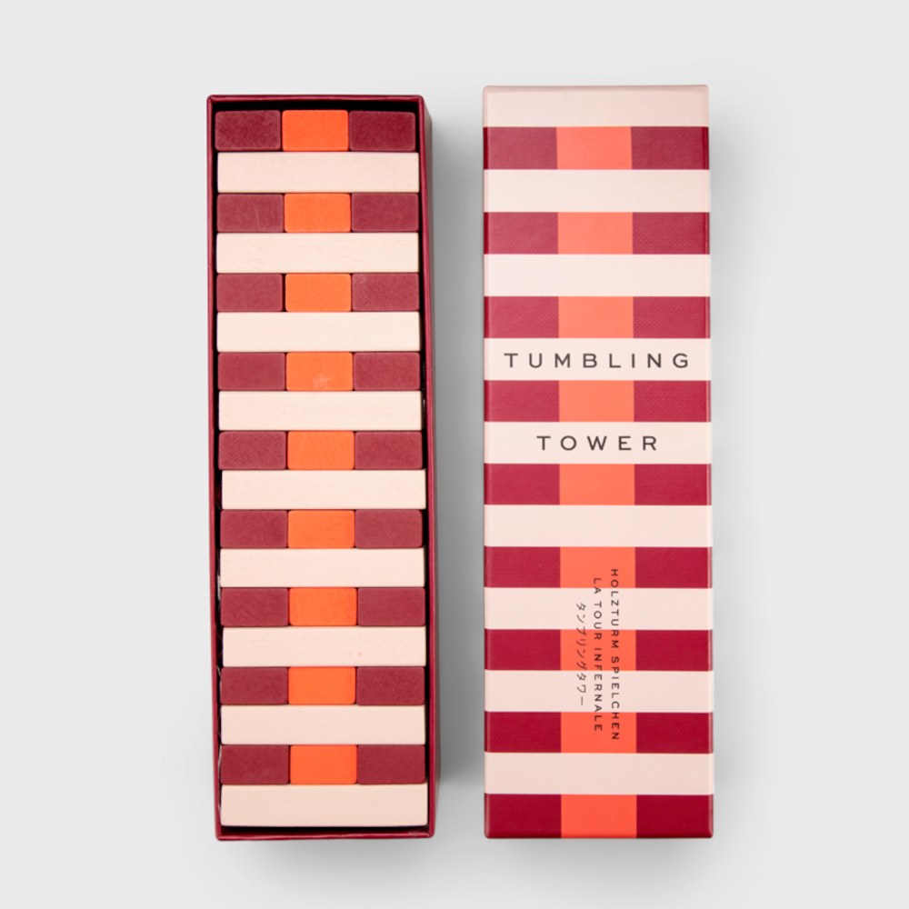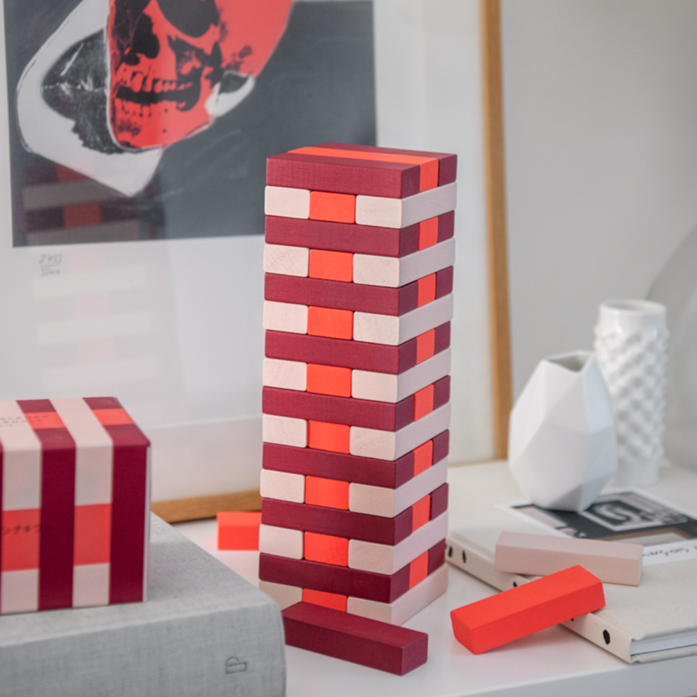 Das Kult-Spiel Tumbling Towers – PRINTWORKS bringt Spannung, Spaß und Stil auf Ihren Tisch. In den eleganten Farben Rot, Beige und Orange wird der Klassiker nicht nur zum Highlight jeder Spielrunde, sondern auch zu einem dekorativen Eyecatcher in Ihrem Zuhause.