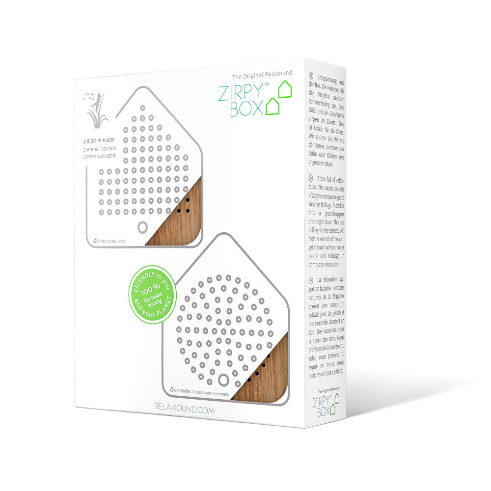 Die Zirpybox 2er-Set »Holz« von Relaxound schenkt Ihnen kleine Auszeiten voller Sommerstimmung. Inspiriert von den Klängen einer warmen Wiese erklingt in einer Box das Zirpen einer Grille, in der anderen die Laute eines Grashüpfers. Zusammen entsteht ein natürlicher Stereo-Raumklang, der Sie sofort an goldene Felder und sonnige Tage denken lässt – entspannend, belebend und wohltuend.