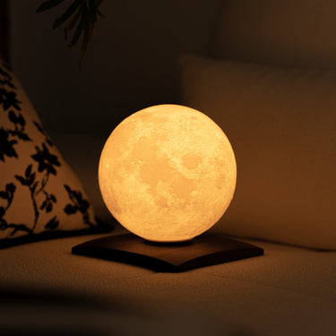 Die 3D-gedruckte Mondkugel mit einem Durchmesser von 18 cm schwebt scheinbar schwerelos über einem Sockel aus hochwertigem Walnussholz. Auf Wunsch beginnt sie sich sanft zu drehen und erzeugt ein hypnotisierendes Schauspiel der Bewegung – oder sie bleibt stationär, wenn Sie eine ruhige, dezente Stimmung bevorzugen.