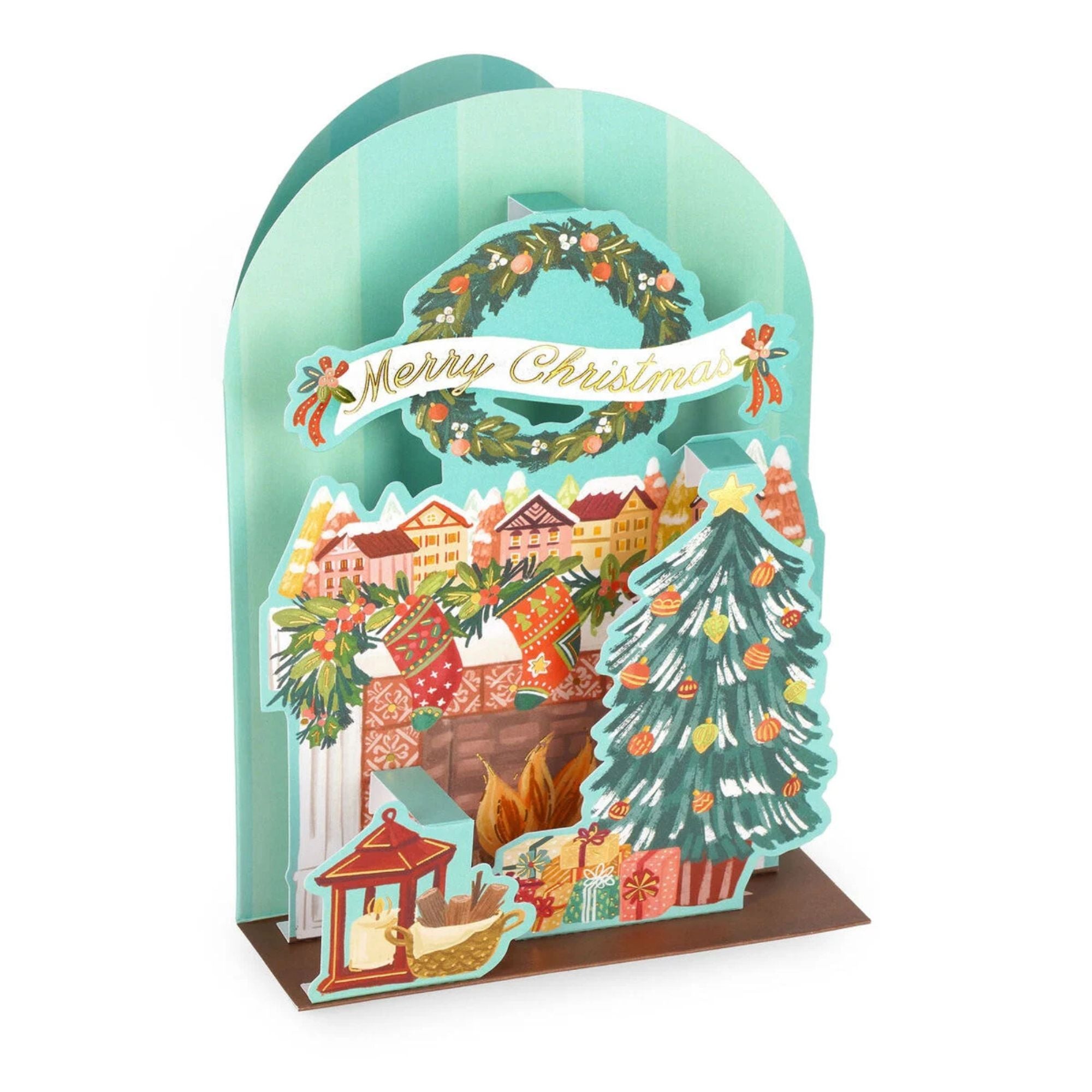 3D-Pop-up-Motiv mit weihnachtlichem Kamin, Tannenbaum und Kranz
