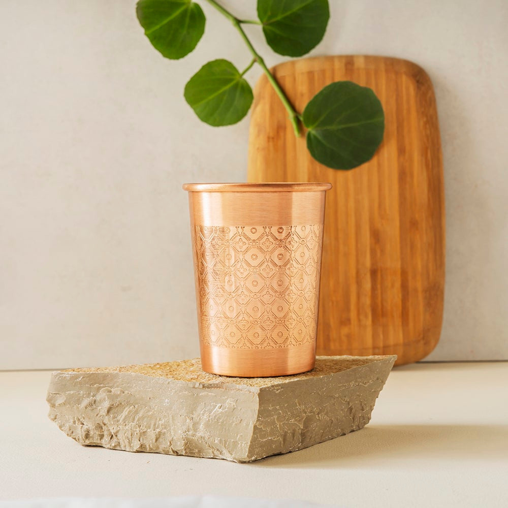 Doch dieser Becher ist mehr als nur ein Schmuckstück: Nach ayurvedischer Tradition kann Wasser, das in Kupfergefäßen aufbewahrt wird, sanft alkalisch wirken, antibakterielle Eigenschaften entfalten und das Wohlbefinden steigern. Schon Yogis auf der ganzen Welt schwören auf diese Trinkweise, die Vitalität und Balance fördern soll.