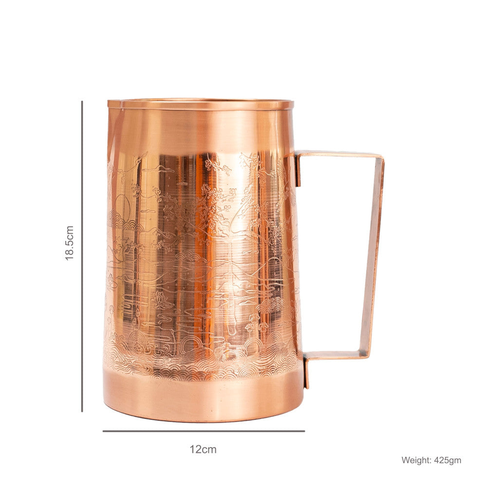 Ein Hauch von Exotik trifft auf jahrhundertealte Tradition: Der Kupferkrug Paradies von Forrest & Love entführt Sie in eine Welt voller Schönheit und Harmonie. Mit kunstvoll gravierten Paradiesvögeln, Lotusblüten und ruhigen Wasserlandschaften wird er zum strahlenden Mittelpunkt auf Ihrem Esstisch oder Couchtisch.