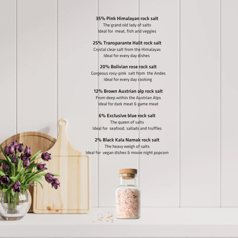 Mit dem ROCK SALT BLEND von Rivsalt holen Sie sich die Vielfalt der besten Steinsalze der Welt direkt in Ihre Küche. Die einzigartige Mischung vereint sechs exklusive Salzsorten in perfekter Balance – von mildem Himalaya-Halit über edles persisches Blausalz bis hin zu aromatischem Kala Namak.
