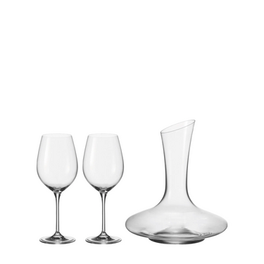 Im Set enthalten sind eine formschöne Karaffe mit 0,75 Litern Nutzinhalt sowie zwei großzügige Weingläser. Gemeinsam bilden sie ein harmonisches Ensemble, das jeden Tisch aufwertet – ob beim romantischen Dinner, beim geselligen Abend mit Freunden oder als festliches Highlight.