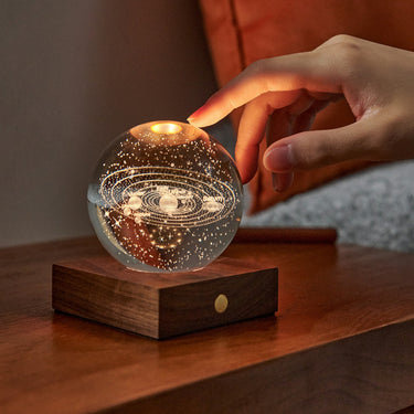 Die Kristallkugel mit 3D-Lasergravur zeigt unser gesamtes Sonnensystem mit allen Planeten – detailreich eingefangen und im bernsteinfarbenen Licht eindrucksvoll in Szene gesetzt. Mit nur einer sanften Berührung des Kupferknopfes am Sockel wechseln Sie zwischen drei Helligkeitsstufen und gestalten so Ihre persönliche Lichtatmosphäre.