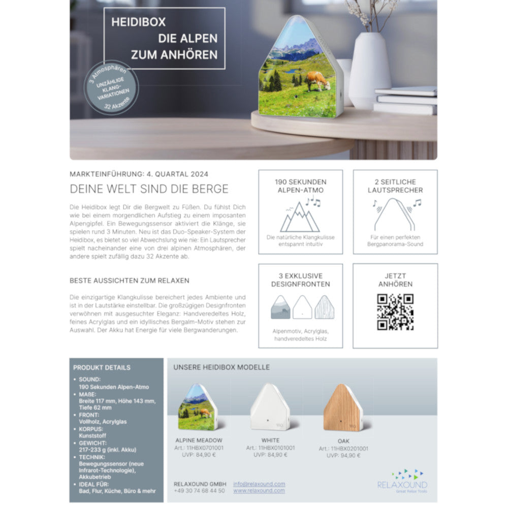 Die Heidibox »Oak« von Relaxound bringt Ihnen das beruhigende Gefühl einer alpinen Auszeit direkt nach Hause. Mit jedem Klang tauchen Sie ein in die Weite der Berge – als stünden Sie selbst auf einer sonnigen Almwiese und atmeten frische Bergluft.