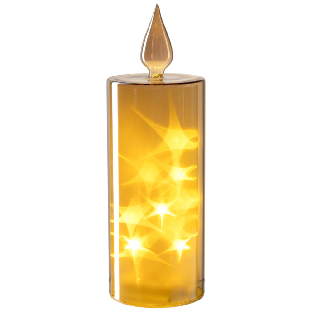 Die 27 cm hohe LED-Kerze aus Glas besticht durch ihren edlen Goldton und den einzigartigen 3D-Lichteffekt, der jeden Raum in ein sanftes, funkelndes Sternenlicht taucht. Dank der besonderen Lüstertechnik erhält sie eine feine Spiegelung, die für eine festlich-elegante Ausstrahlung sorgt.