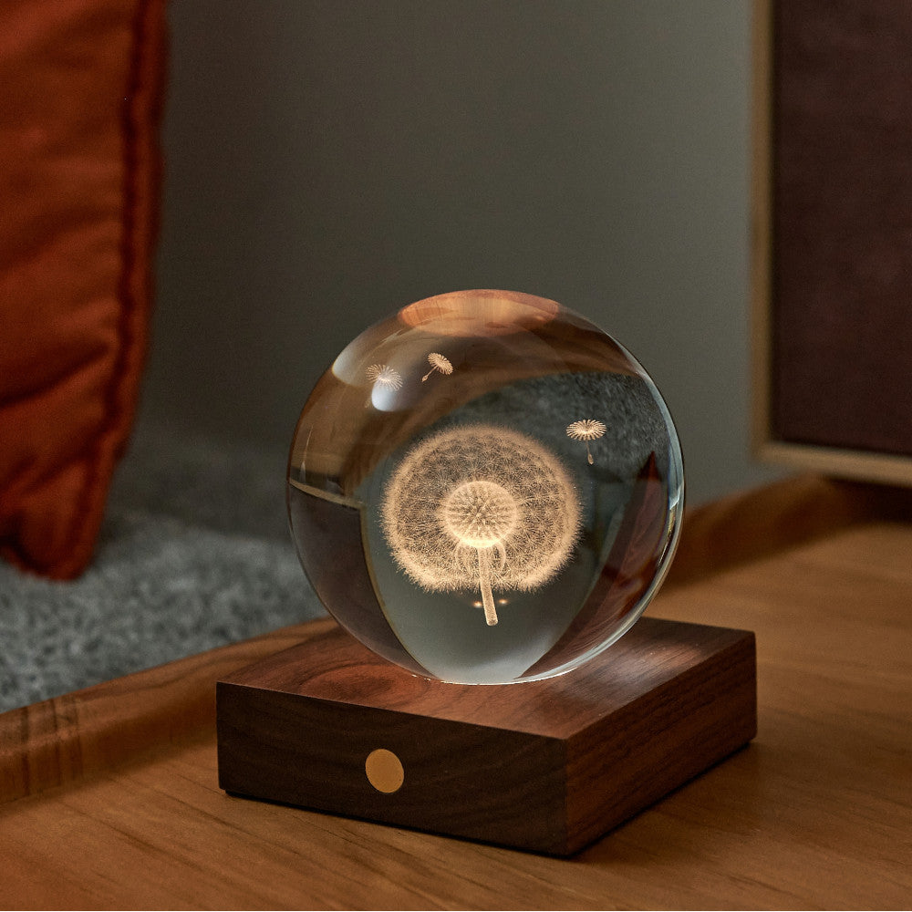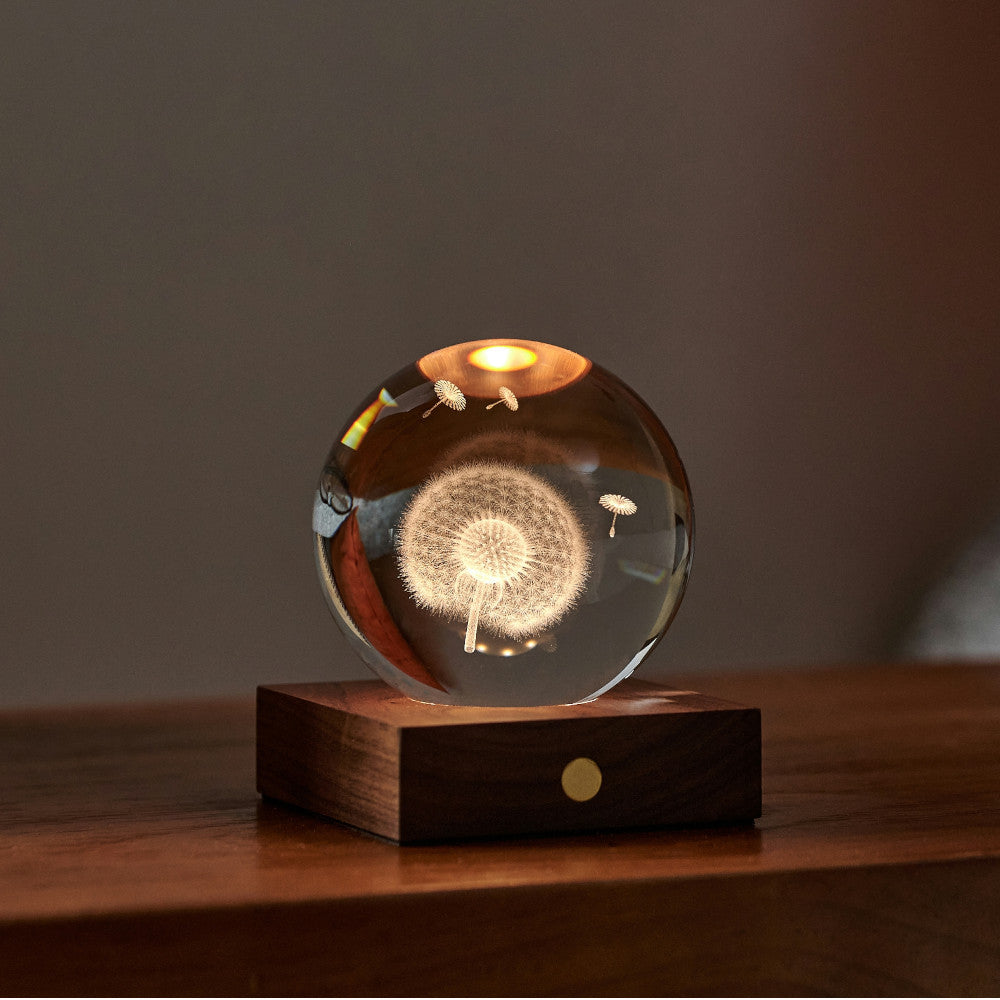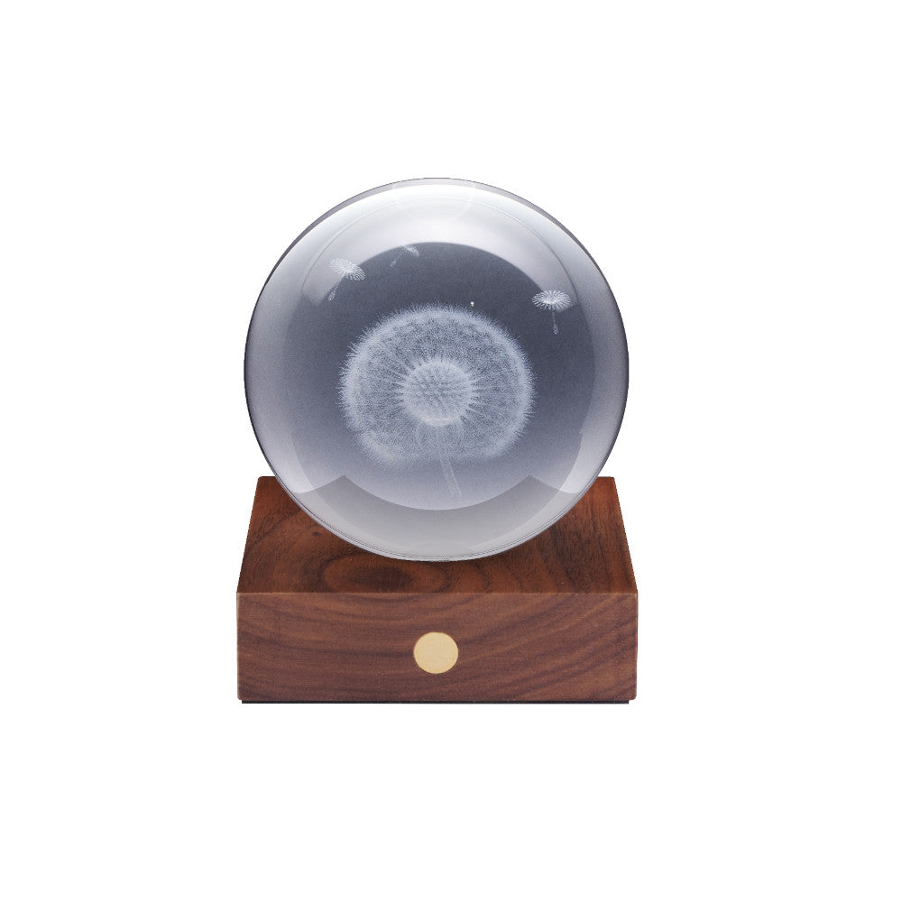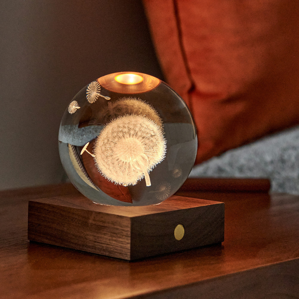 Die Kristallkugel mit 3D-Lasergravur zeigt einen filigranen Löwenzahn, der im bernsteinfarbenen Licht eine bezaubernde Wirkung entfaltet. Mit nur einer sanften Berührung des Kupferknopfes am Sockel wählen Sie zwischen drei Lichtintensitäten – ob sanftes Stimmungslicht, dekorative Akzente oder ein strahlender Blickfang.