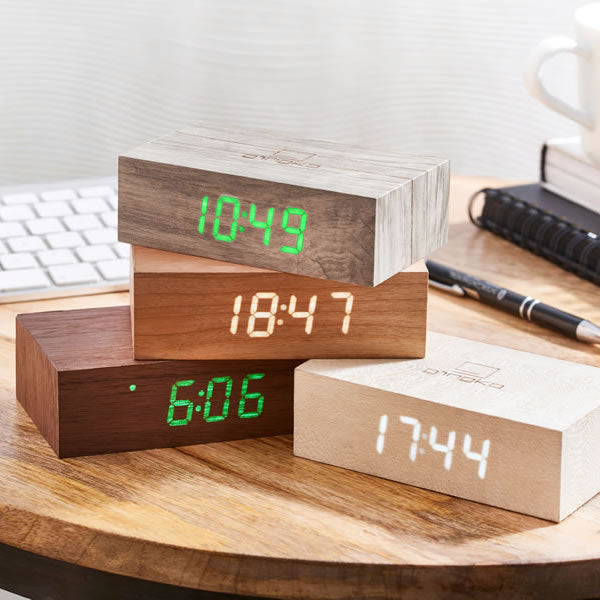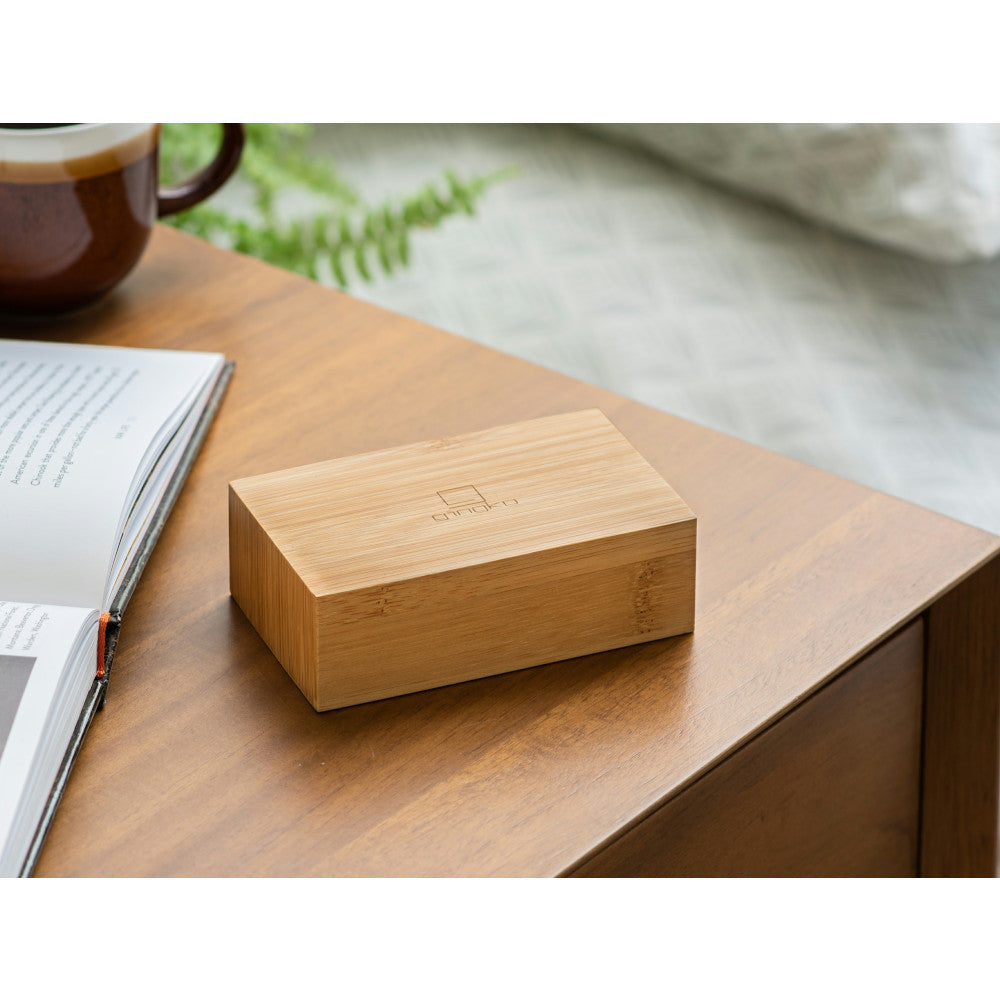 Die von Hand gefertigte Bambus-Oberfläche bringt natürliche Wärme in Ihr Schlafzimmer, Büro oder Wohnzimmer. Das weiße LED-Display reagiert auf Geräusche oder Berührung und verschwindet automatisch, wenn es still ist – perfekt für erholsame Nächte ohne störendes Licht.