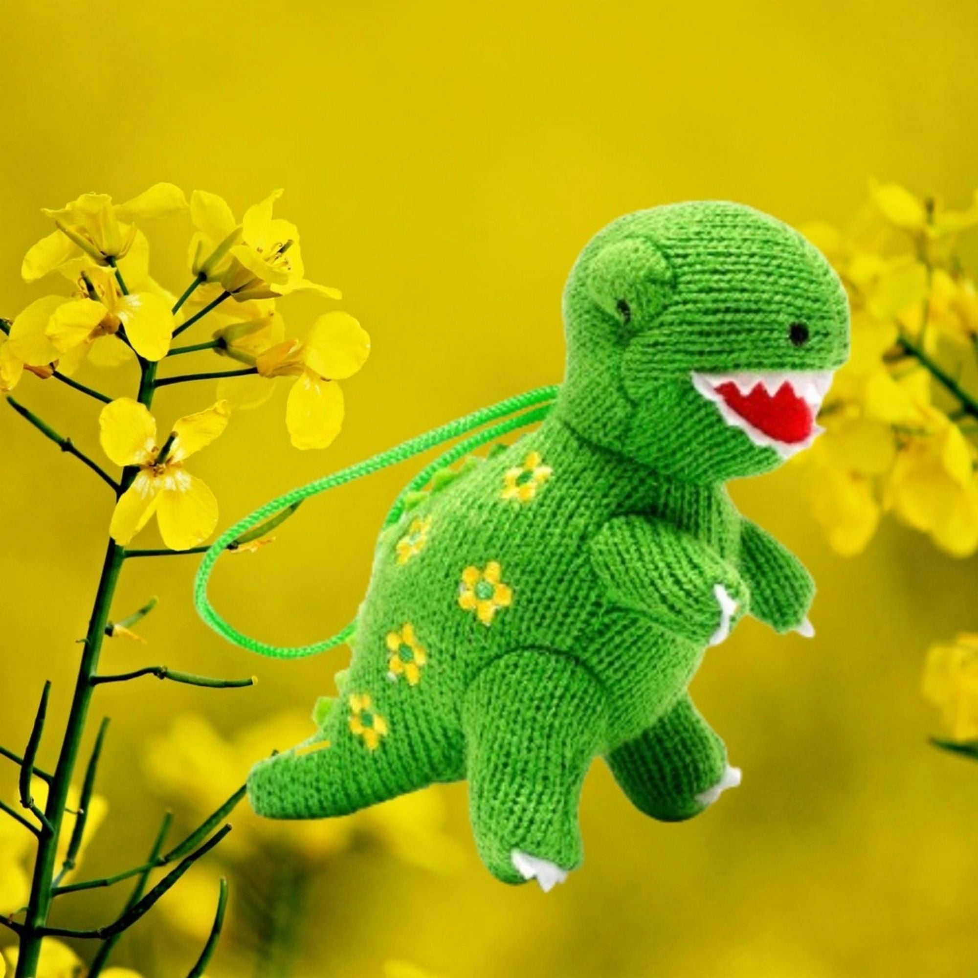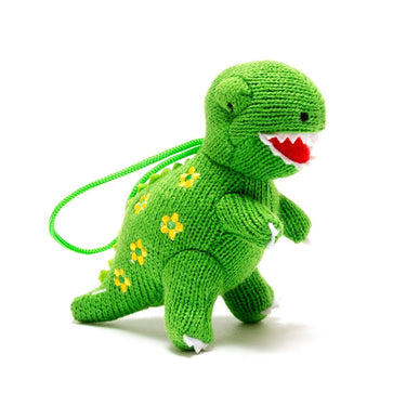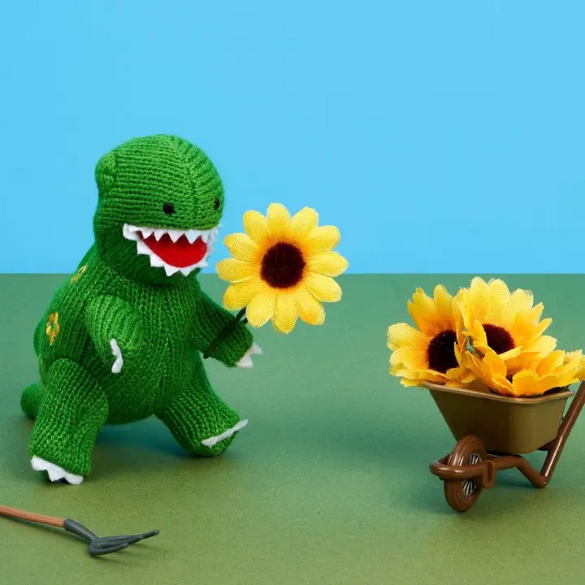 Gestrickter grüner T-Rex-Dinosaurier mit Blumen • Best Years Ltd