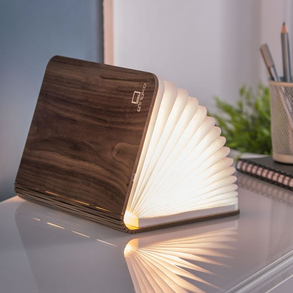Das SMART BOOK LIGHT MINI in Walnuss von Gingko ist eine Leuchte, die mit Design und Funktion gleichermaßen begeistert. Auf den ersten Blick wirkt es wie ein edles Buch mit hochwertigem Walnussholz-Einband – doch beim Aufklappen offenbart sich ein magisches Lichtobjekt.