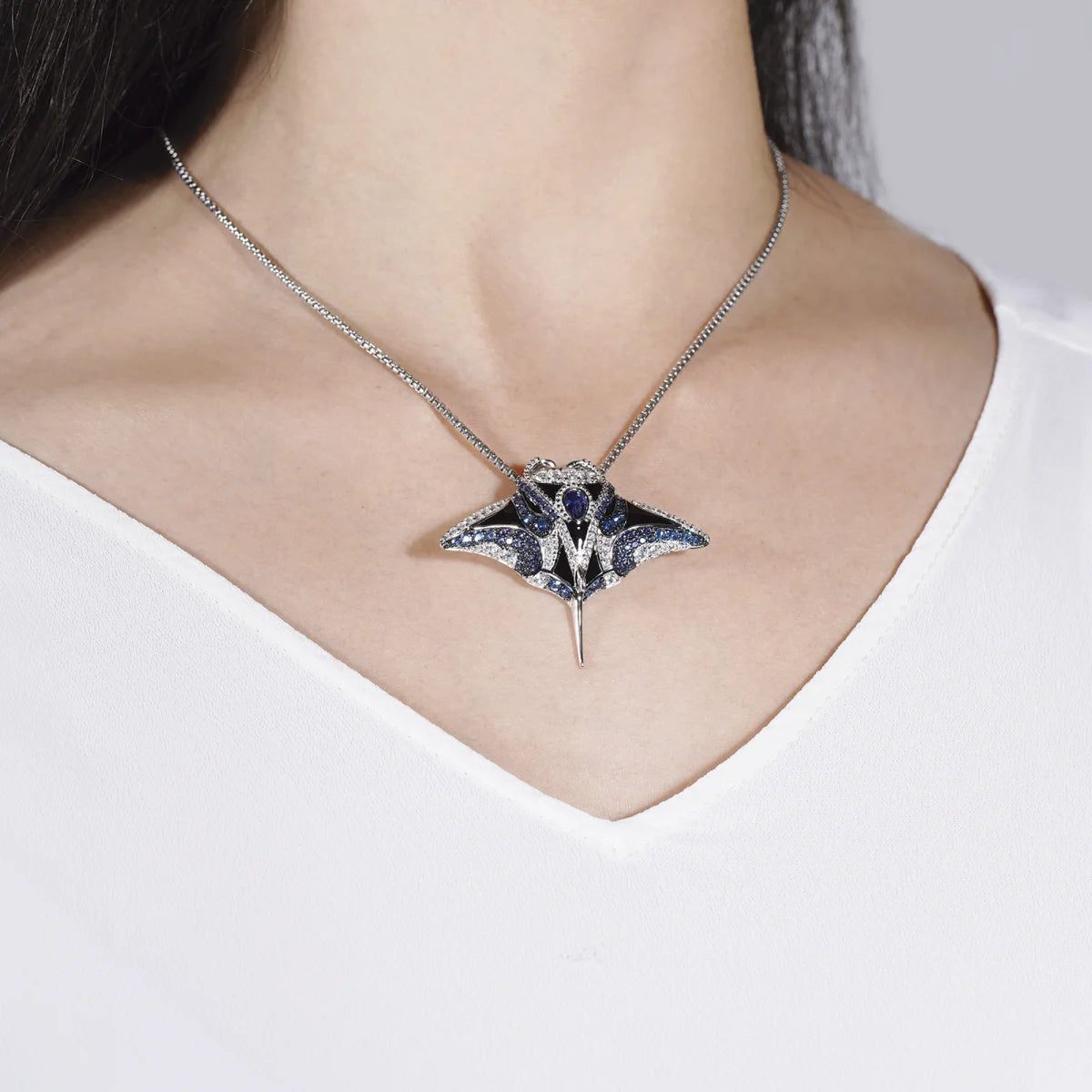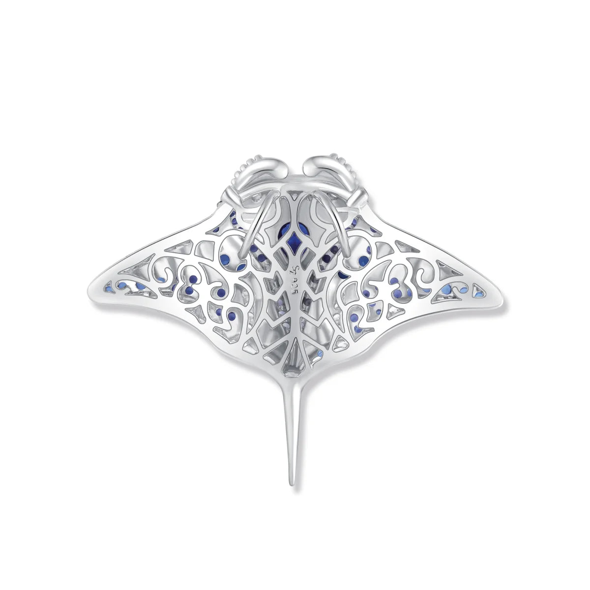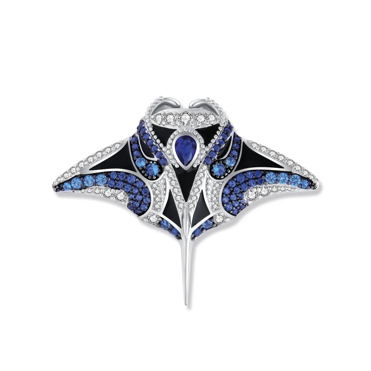 Die blauen und weißen Zirkonia Steine funkeln wie Sonnenstrahlen, die durch türkisfarbenes Wasser tanzen. Besonders eindrucksvoll: ein tiefblauer, tropfenförmiger Zirkonia auf dem Rücken des Mantas – ein Highlight, das sofort Aufmerksamkeit auf sich zieht. Feine Emaille-Details verleihen Struktur und Tiefe, während die Rhodium-Beschichtung dauerhaft für strahlenden Glanz sorgt.