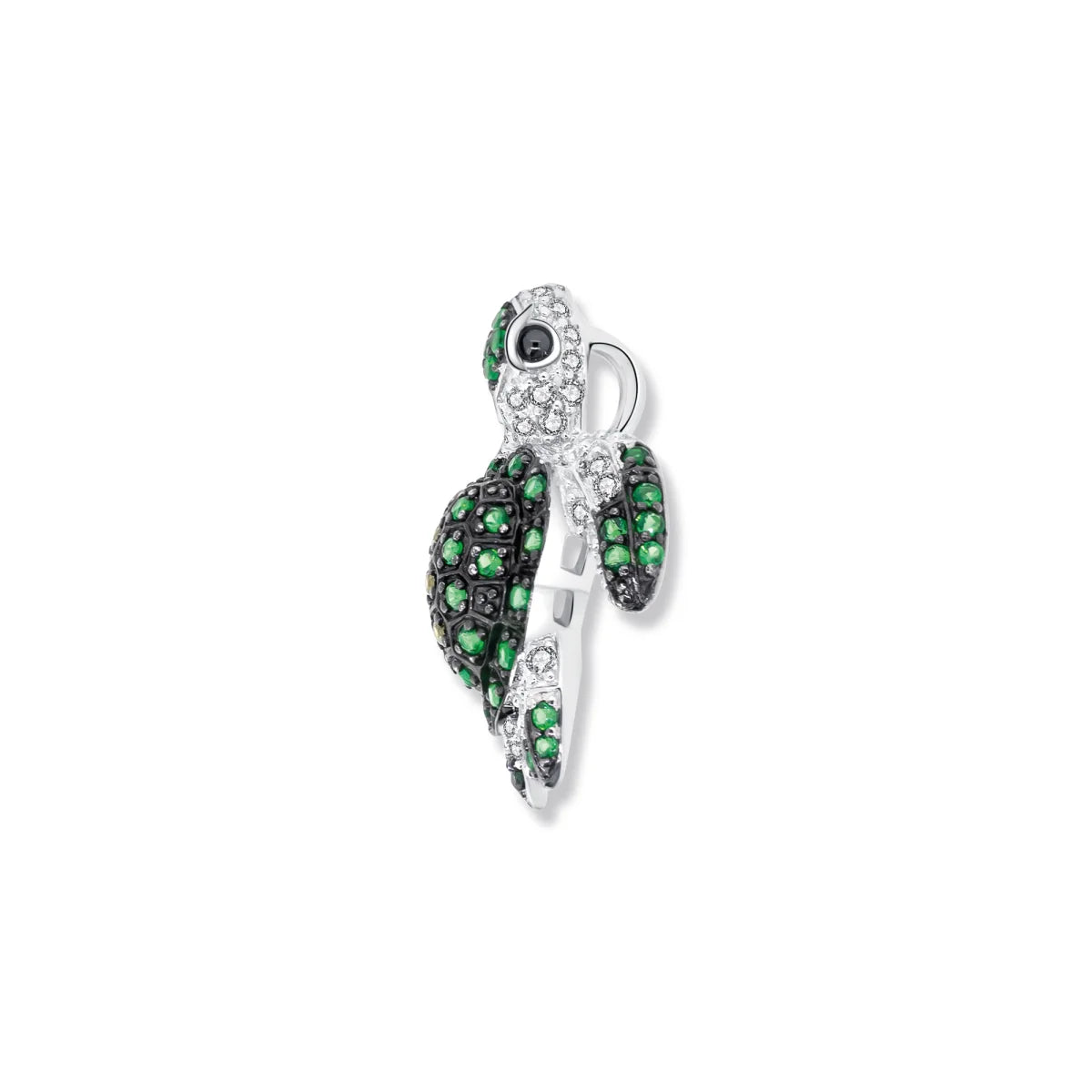 Dank der kunstvollen Kombination aus rhodiniertem und geschwärztem Silber entsteht eine besondere Tiefenwirkung, die die fein ausgearbeiteten Konturen eindrucksvoll betont. Grüne und weiße Zirkonia Steine setzen funkelnde Akzente und erinnern an die Schönheit der Natur und das warme Licht der Sonne auf dem Panzer einer Meeresschildkröte.