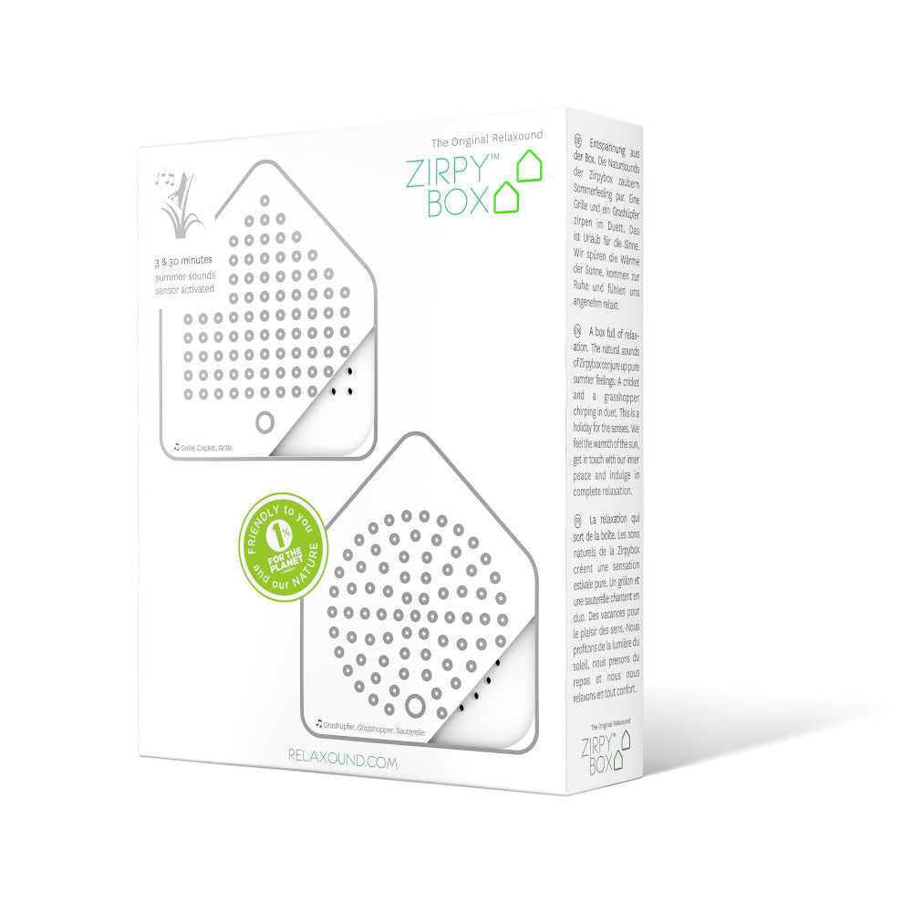 Die Zirpybox 2er-Set »White« bringt Sommerfeeling pur – entspannen Sie mit Grillen- und Grashüpfersounds im Duett.